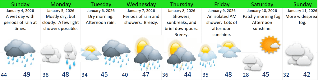 1.) We’re in the midst of a very calm and low key weather pattern. Temperatures continue to vary each day depending on winds, cloud cover, and fog. Highs ranging from the mid 5os (like we saw just a few days ago) down to the 30s (like we are seeing today). Lows remain more consistent continuing to drop into the upper 20s or low 30s each night. This weather pattern lasts through next Wednesday.