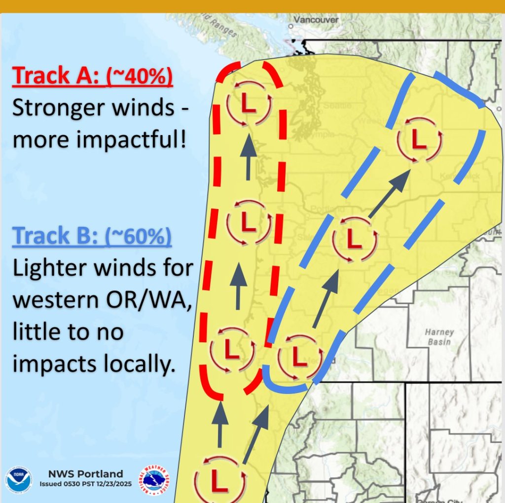 I’m watching one storm for Christmas Eve that could cause some gusty winds, especially up in the mountains and over in central Oregon. Besides that storm, the weather looks pretty calm through Sunday the 28th. This gives us a nice window to travel and enjoy Christmas without weather impacting us too much.