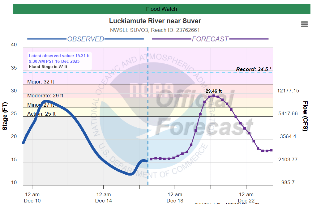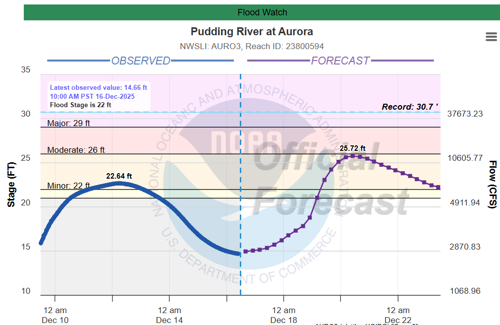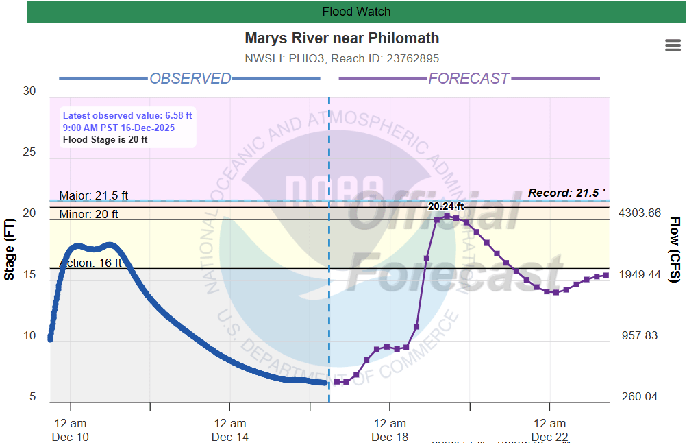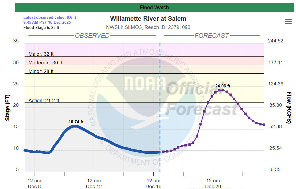 You can also find out river level forecasts from this link here: River level forecasts. Just keep in mind that these river forecasts change (up and down) frequently, and are meant to give you a general idea. The South Yamhill, Pudding, and Luckiamute rivers are three specific rivers expected to approach moderate flood stage levels.