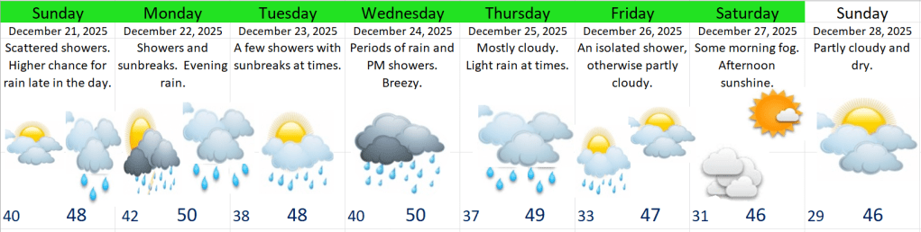 Thursday (Christmas Day): Wet with light rain much of the day. High of 48°.