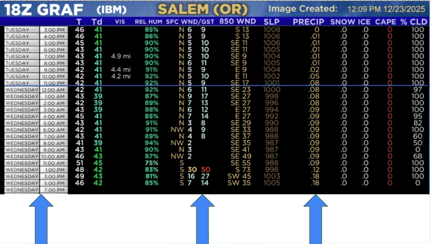 1.) I’m forecasting wind gusts of 45 to 55mph here in the Willamette Valley. This is plenty strong enough to cause power outages and bring down more trees. This will be a very short hitting, but powerful storm. Look at this forecasting chart for Salem. I have arrows pointing to the day and time columns, the surface wind gusts, and the precip column.