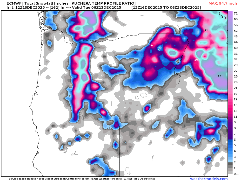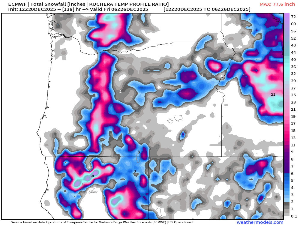 This will be a cooler stretch of days with highs here in the valley around the upper 40s. As of right now, no big storms during this timeframe, but a cool, onshore flow will keep showers going in the lowlands, and snow up in the mountains. In fact, it should be a pretty good mountain snow pattern. Totals through Monday night shows the Oregon Cascades picking up a few feet of snow. Maybe there will be skiing in time for Christmas after all. Chains or traction tires will either be recommended or required going through the passes Fri – Mon.