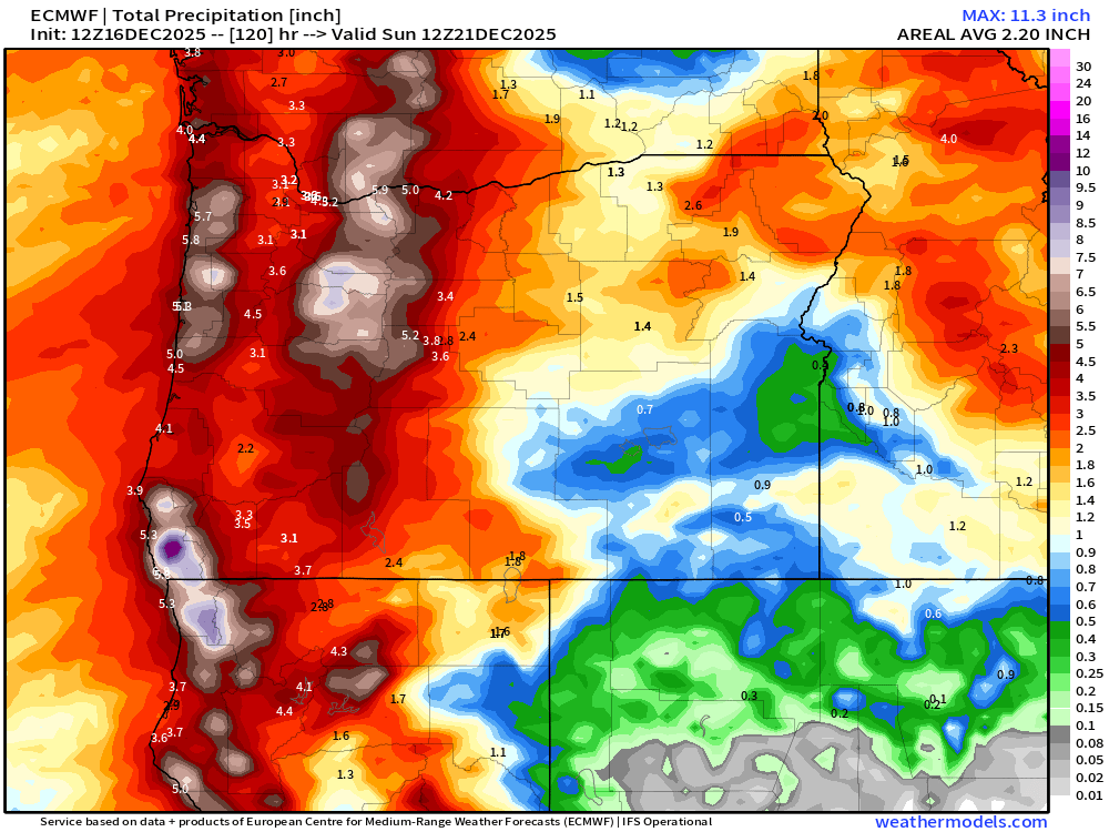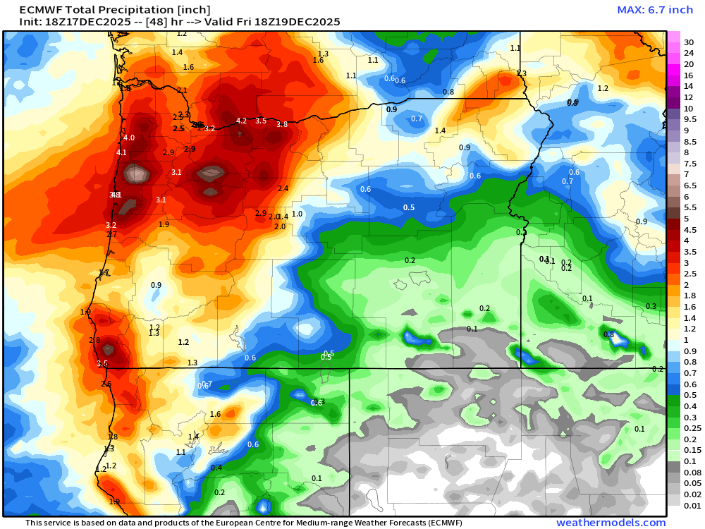 Here in Oregon, this will be more impactful than last week’s rainstorm. Confidence is growing that steady rain will begin early Thursday morning, and lasts through the first part of Friday before switching over to a few afternoon showers. Rainfall rates look impressive. This map shows rainfall totals between now and Sunday morning.