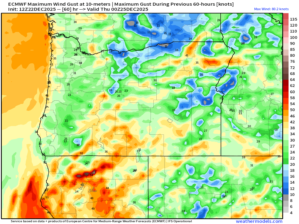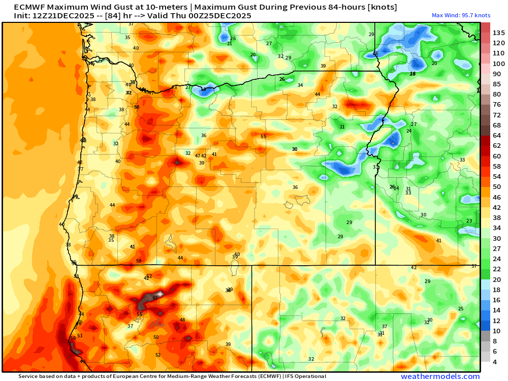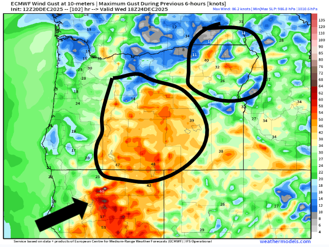 Wet and breezy on Wednesday, but nothing too strong in our area. The strongest winds will take place in the Cascades, central Oregon, Wallowa mountains, and the Siskiyou Pass heading down towards Shasta. Because Christmas Eve is such a big travel day, I think it’s worth keeping an eye on this forecast. I did a little sketch to highlight these areas for you all. I’m clearly not an artist lol. The numbers you see on here are estimated max wind gusts in knots.