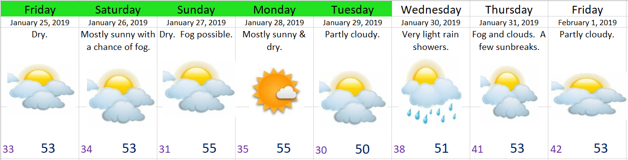 Following up on our “warm” weather potential this weekend I’ve decided to lower the high temps just a smudge. It will still be above average, but only mid 50s at best. Patchy fog is possible just about every single day this week which could keep temps cooler than what is currently forecast.
