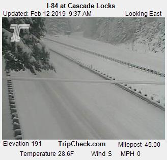Then there was the gorge where cold air kept snow falling along I-84 all day long. Here’s I-84 at Cascade Locks from Tuesday morning.
