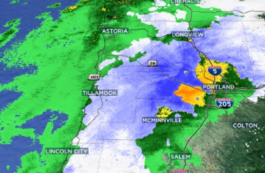 The past 36 hours have been wild and interesting to watch unfold at least from a weatherman’s perspective. We had gusty south winds all Monday night and through Tuesday morning. I’m sure you noticed them. Gusts to 40mph were reported four separate times at the Salem airport. Meanwhile areas to our northwest have been pounded by heavy rain causing flooding on many creeks and streams specifically up in Washington, Clatsop, and Tillamook counties. Here’s what the radar looked like Tuesday morning. Two things stand out. First is the heavy rain just to our north, and the second is the heavy snow (in blue) just west of the Portland Metro area.