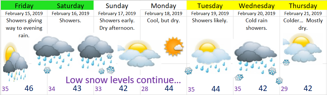 Saturday: Snow level will start quite low (around 1000’) before rising to 2000’ later in the day with a few showers.