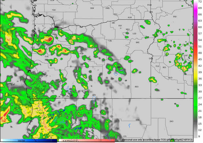 Next I have an image of the simulated radar good for 4pm local time. The oranges and reds indicate storms right over the valley.