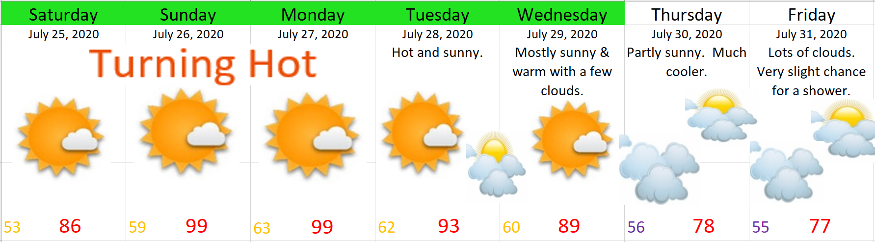 As you can see, plenty of hot weather, and aside from a very slight chance for a shower or two on Thu & Fri, no decent shot at rain in sight, and if we look even further out it appears as though August will start off on the warm and sunny side.