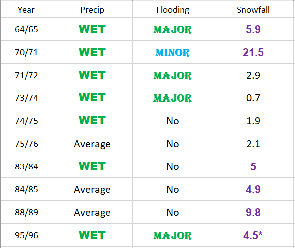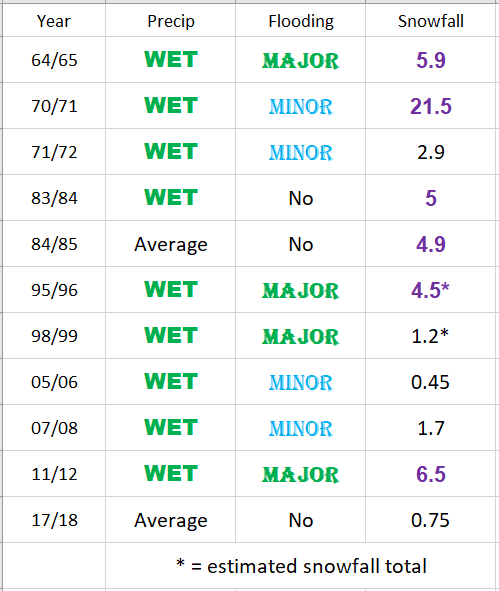 For reference, here are all La Nina winters (regardless of their strength) since 1960. Again, the pattern is the same. Almost all of them ended up wetter than normal, many of the years had flooding here in the valley, the majority of these years had a good mountain snowpack, and all of them produced at least some measurable snow (albeit some years it was no more than an inch or two) down to the valley floor.