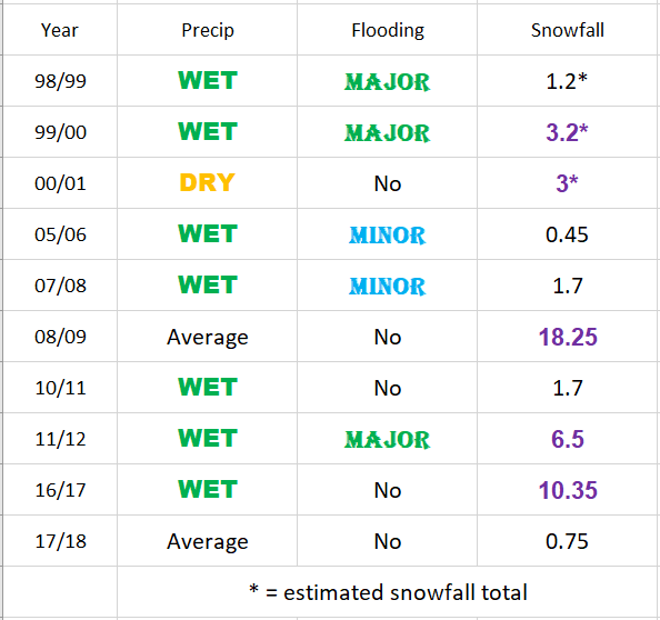 For this discussion I analyzed 11 La Nina winters which had similar strength to the one being predicted this year. I’ll also be referring to the months of November through March which I consider to be our primary storm/winter season. There are some years where the storm season really gets going during mid October, and this could be one of those years, but the statistics I looked at and the focus of this discussion are centered on the months of Nov – Mar. This first chart shows those 11 La Nina winters and how they fared in terms of precipitation for Salem, whether or not there was a valley flooding event, and Salem’s total snowfall in inches during each of those winters.