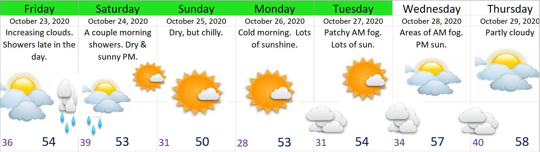Sun – Tue: Even colder with morning lows 28 – 32 degrees, and highs 50 – 54°.
