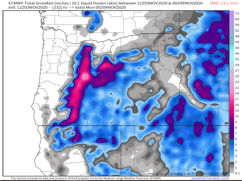 Here are a couple of maps showing both the total precip and total snowfall measured in inches through Saturday night. Main take away is it’s looking wet down here and snowy up in the Cascades with generally 10 to 15 inches expected starting early Friday morning as the snow level slowly drops down to near 3000′.