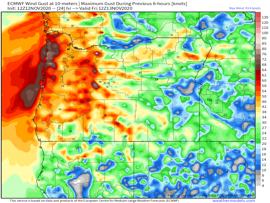 - This chart shows peak wind gusts in knots at 4AM Friday morning. The 47 over Salem translates to 54mph which I think is a little overdone, but we will see. Either way it’s going to be quite windy tonight and Friday morning.