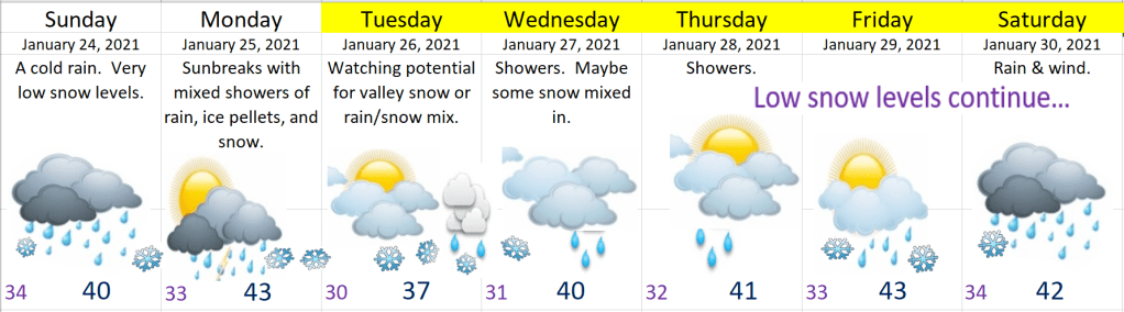 1.) Sunday. Hmmm, I’ve seen and heard lots of rumors about snow this day, but meh, I’m not all that impressed. Unless something changes, I’m going with a very cold rain with snow mixing in at times. It’s possible that it falls as all snow early tomorrow morning for a little while, but it’s going to be extremely difficult for it to accumulate on the valley floor as temperatures are going to likely stay a few degrees above freezing. There’s a better shot at seeing a brief coating of snow 500 to 1000 feet – maybe up to an inch. A few inches of snow are possible above 1000′.