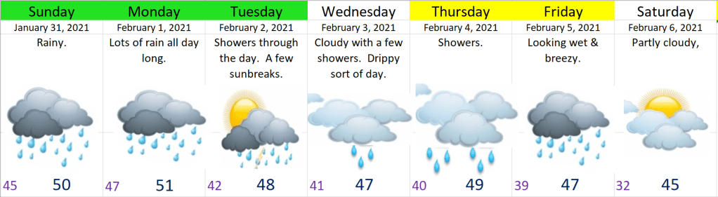 3.) I’ve highlighted Thursday & Friday yellow on the 7 day graphic indicating lower than normal confidence. Right now I’m leaning towards those days being wet, but look for a new update in a day or two with hopefully more details.