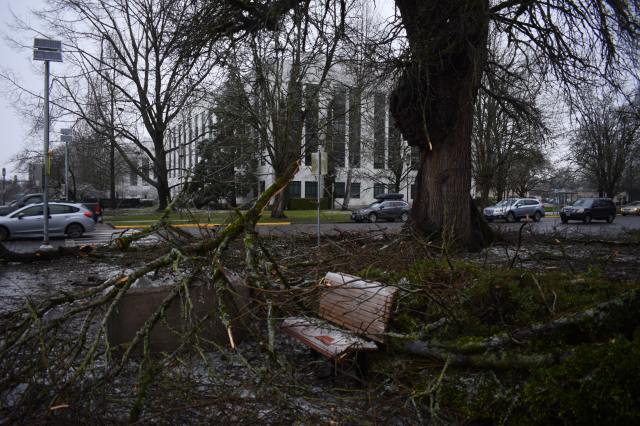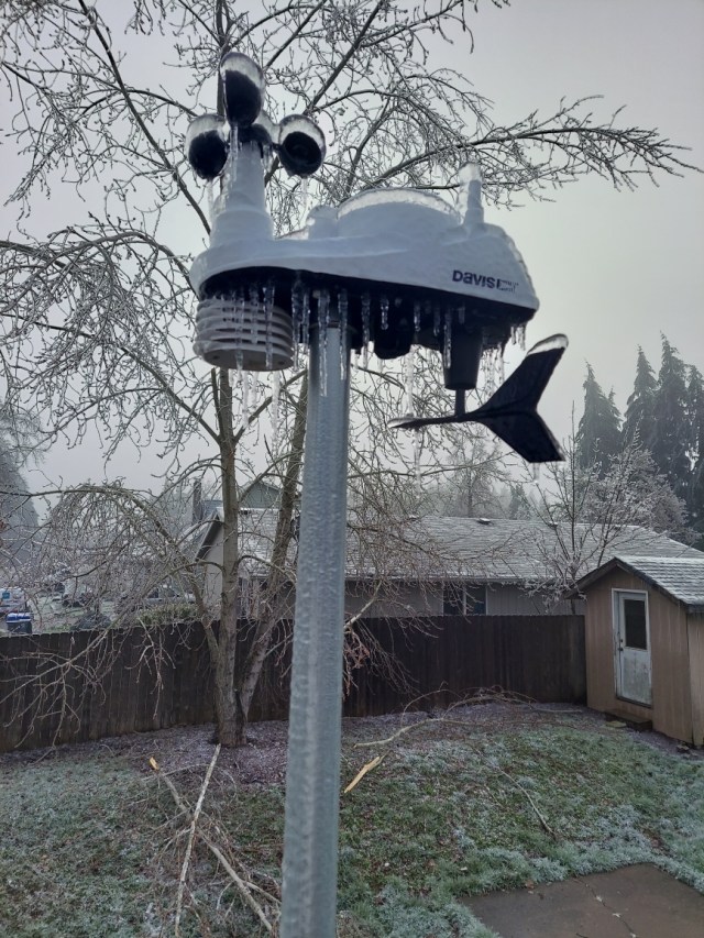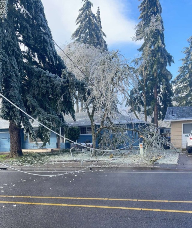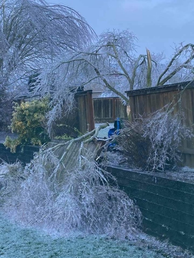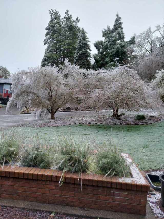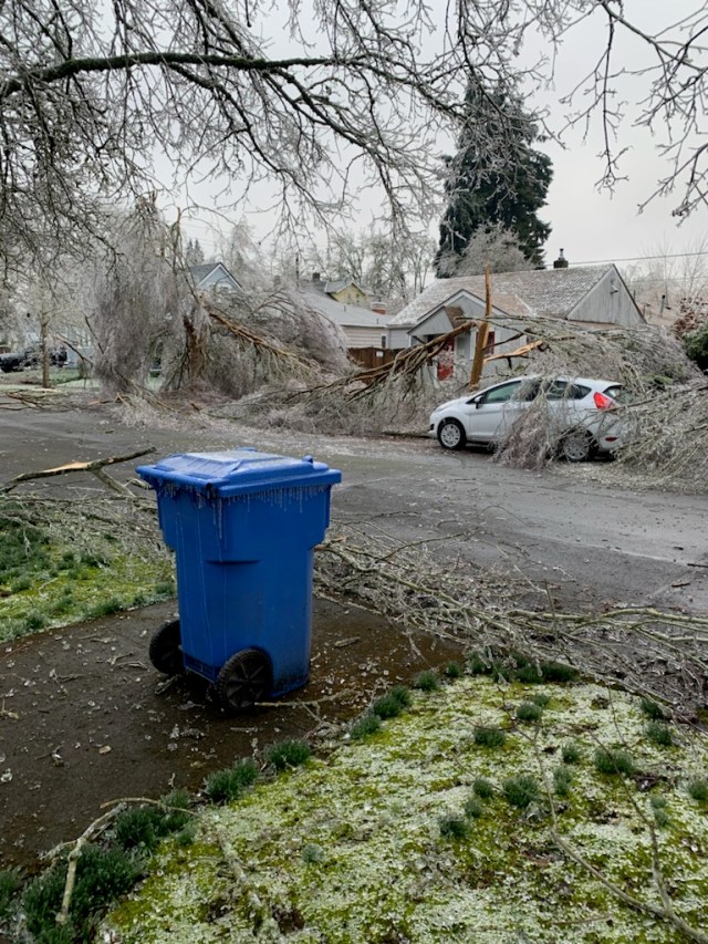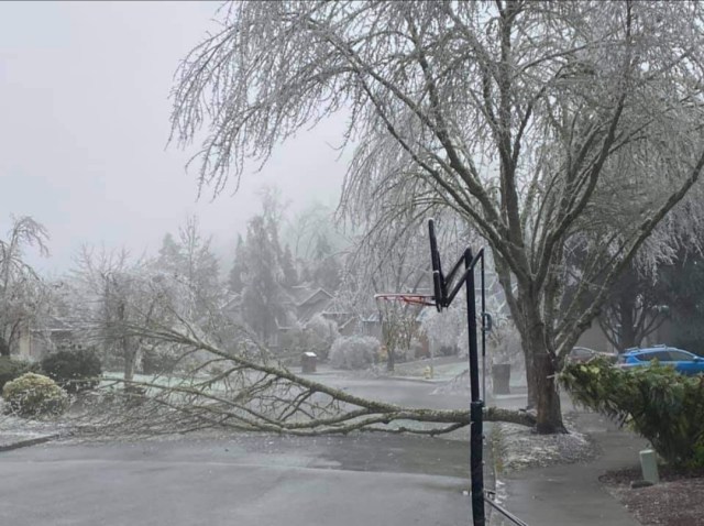 Friday was brutal with light freezing rain on and off all day long and a high of 30°. I still need to do some more digging, but it appears Salem tied its record for coldest high temp that day. BRRR!! Then a second and much stronger pacific storm rolled in right at sunset bringing around an inch of additional freezing rain which froze onto all elevated surfaces in the Salem area. A lot of widespread totals 1 – 1.25″ with a few isolated locations reported up to 1.5 inches of freezing rain when all was said and done! That is a ton of extra weight for trees and power lines to hold up which is why we saw so much destruction. To make matters worse the Portland area continued to see freezing rain Sunday through early Monday morning which led to thousands of outages up in that area as well turning this into a region wide disaster.
