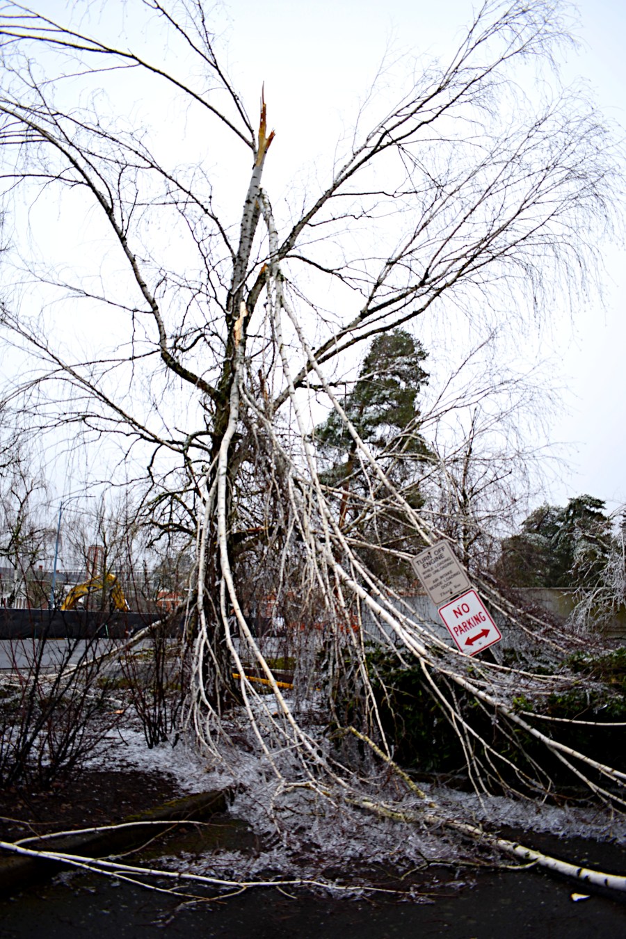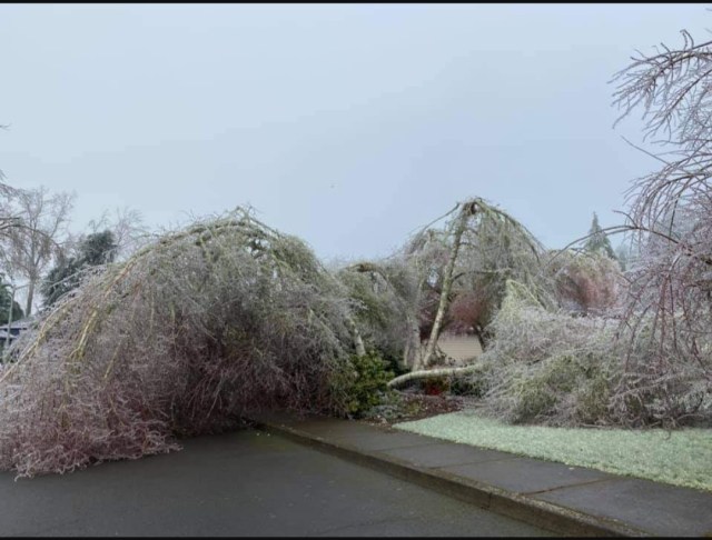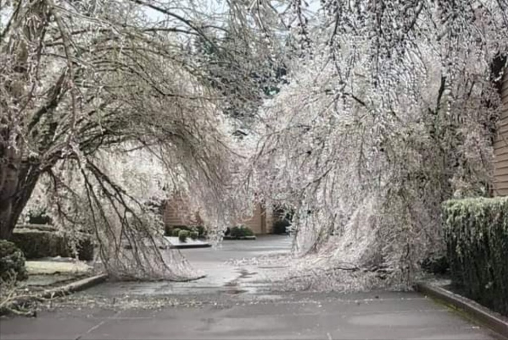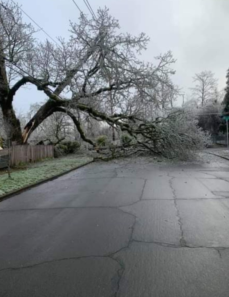 The shear amount of ice was hands down the main reason this ended up being a historic event here in the mid Willamette Valley, but there is a little more to it than that. The Salem area picks up somewhere close to a quarter inch of freezing rain ever few years with the winter of 2016/2017 being the last time we saw any. December 2008 gave parts of the Salem area a fairly major ice storm with around .75″ of ice. One has to go back to January 2004 for the last time any part of Salem received totals of an inch or so of freezing rain, and you have to go much further back (several decades) in time to find accumulations around here which come close to 1.5″ of ice!! So it’s been a very long time since we have seen a major (inch plus) ice storm. The long period of relatively “tame” weather has allowed our deciduous trees to grow and grow and grow much lager than they otherwise would be. Plus it’s not like Oregonians are known for keeping their trees trimmed lol. Something we could discuss another time… Anyway, the combination of overgrown trees and a historic amount of ice coupled together to give Salem and parts of the Portland metro area one of the most costly, darkest, and longest power outage disasters in decades.