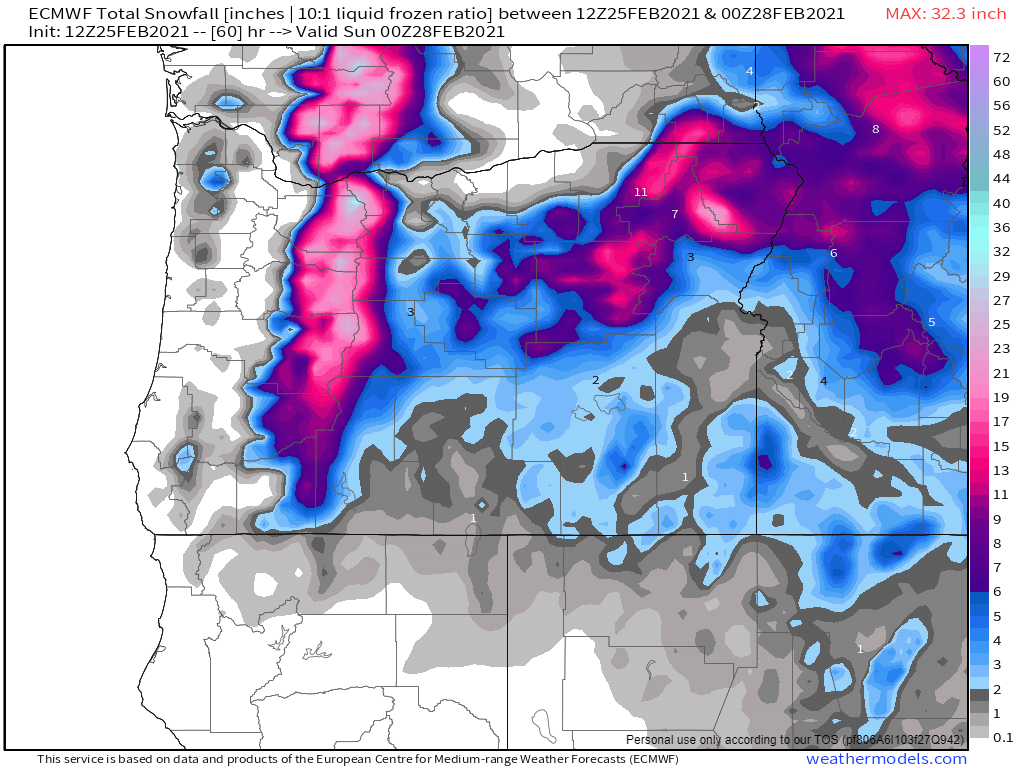 Up in the Cascades snow levels will hover around 1500 – 2000′ with tons of fresh snow up there over the next 36 hours. This chart is showing 1 to 2 feet of new snow now through Saturday afternoon depending on elevation. This is in addition to the several inches of snow which fell all day long today. It’s going to be quite the snowstorm up in the mountains as winds will be gusting 25 to 35mph creating near whiteout conditions at times on Friday. Not a good time to travel up there. Saturday and Sunday will be much better, especially after around noon on Saturday.