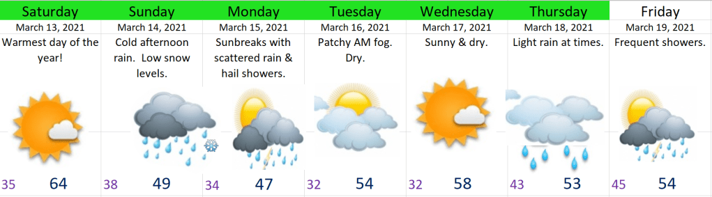 1.) Sunday and Monday we have a brief, but fairly major cool down on the way. Rain moves in Sunday afternoon transitioning into scattered showers on Monday. Snow levels will drop down to near 1000′ early Monday morning.
