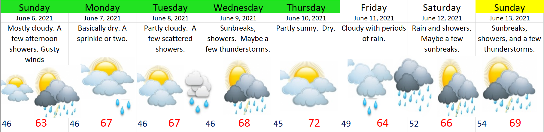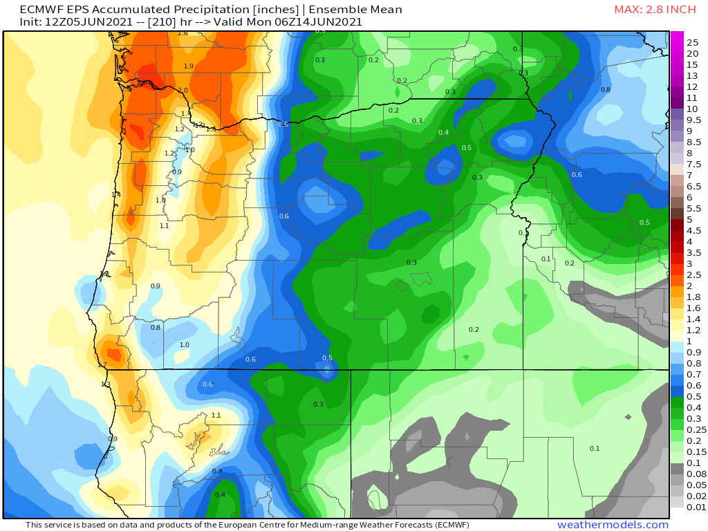 3.) Tuesday & Wednesday. Partly cloudy with PM showers. Showers will favor the coast, Coast Range, and the Cascades. Slight chance for a thunderstorm or two. Because the showers will be scattered in nature, there’s a chance some of you stay mostly dry these two days while others experience a brief soaking.