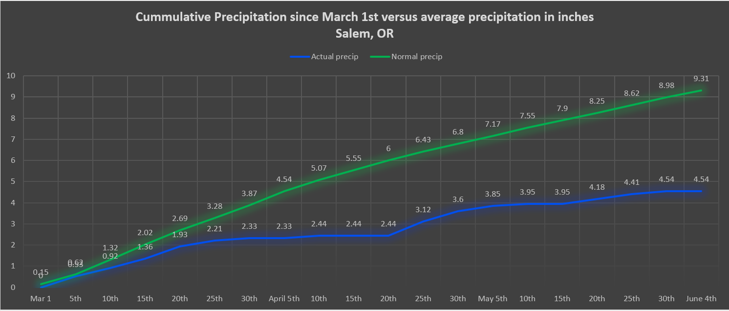 Basically if this materializes everyone here in the valley should pick up at least an inch of rain over the next 8 days with more in the mountains and along the coast. Even central and eastern Oregon should get in on the action with rain expected over there as well. This is really good news for our drought conditions, and we need it! Below is an up to date version of the map I shared a few days ago. It shows total rainfall in inches here in Salem since March 1st versus the total we should be at.