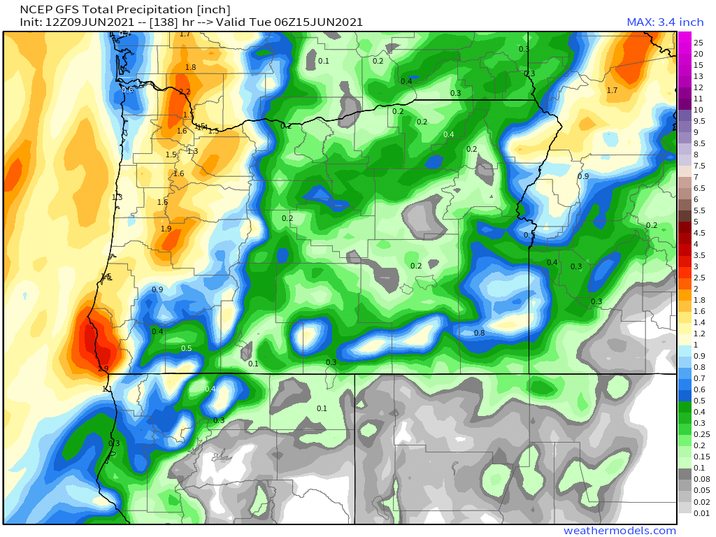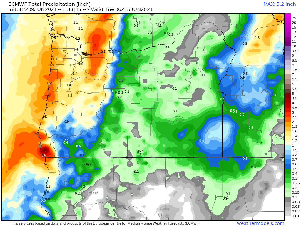 The main “rain event” from the start has been and still is looking to be Friday through next Tuesday as several waves of moisture ride up into western Oregon. Trying to pinpoint exactly when these waves of moisture will show up is proving to be more difficult than usual due to the trajectory/path of this storm system. The main thing to keep in mind is we will have several rounds of steady rainfall Sat through Tue with breaks of dry weather mixed in between. There will also be a chance for thunder Sun – Tue. Below is the forecasted total precipitation through Monday night from both of the major weather models.