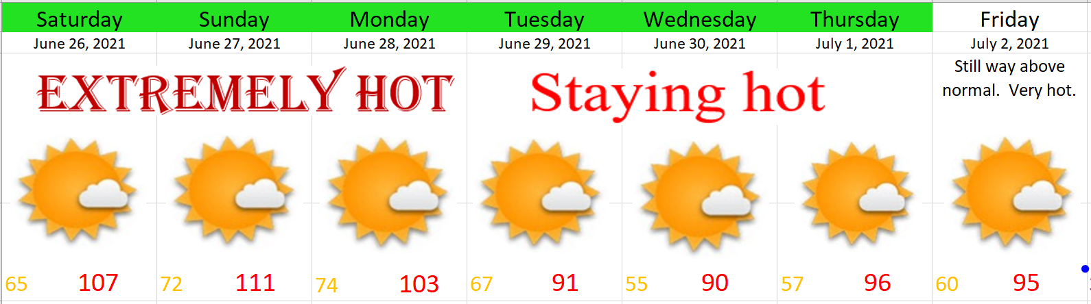 2.) I got to say it feels weird forecasting a high temperature of 111 as it would be hotter than anything we have ever seen here since records began in Salem over 120 years ago. Salem’s all time high temp is 108° recorded back in August 1981, and it blows my mind to think we could top that and maybe even by several degrees…