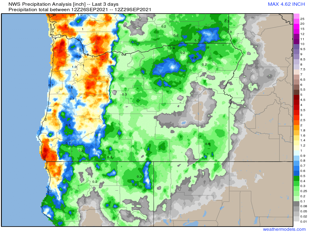 Did you hear about the weak tornado that touched down up in Battle Ground Washington? Not much damage as it was very weak, but still “exciting” as weather goes around here. We just wrapped up our second big soaking of the month with Salem picking up well over an inch of rain over the past 3 days. So after a long dry summer we are now having a wetter than normal month which is great news! Check out the rain totals since Sunday.