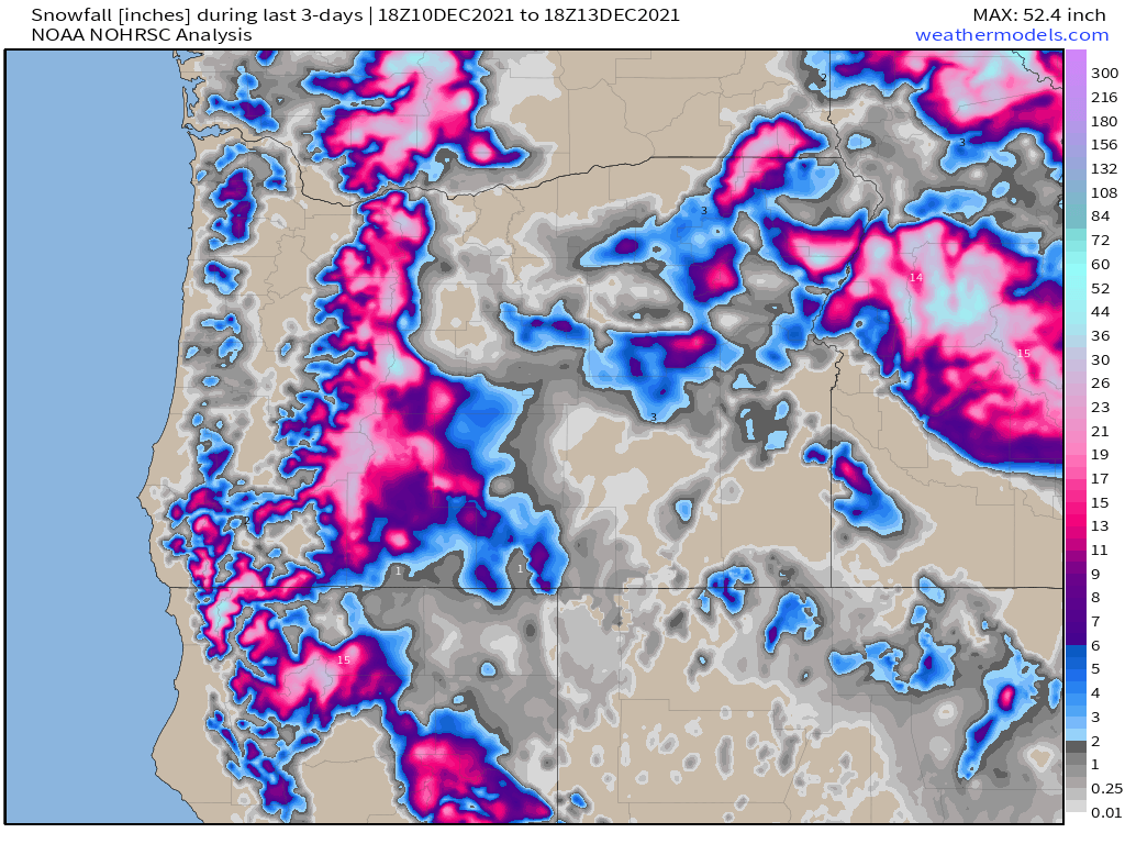 A much cooler airmass also rolled in with this storm allowing for copious amounts of snow to pile up in the Cascades. This image shows 2 to 3 feet of snow have fallen widespread across the Cascades with closer to 4 feet on the highest peaks! 6 to 12 inches of snow fell in the Coast Range. Take note this does not take into account all the snow that fell this afternoon/evening.