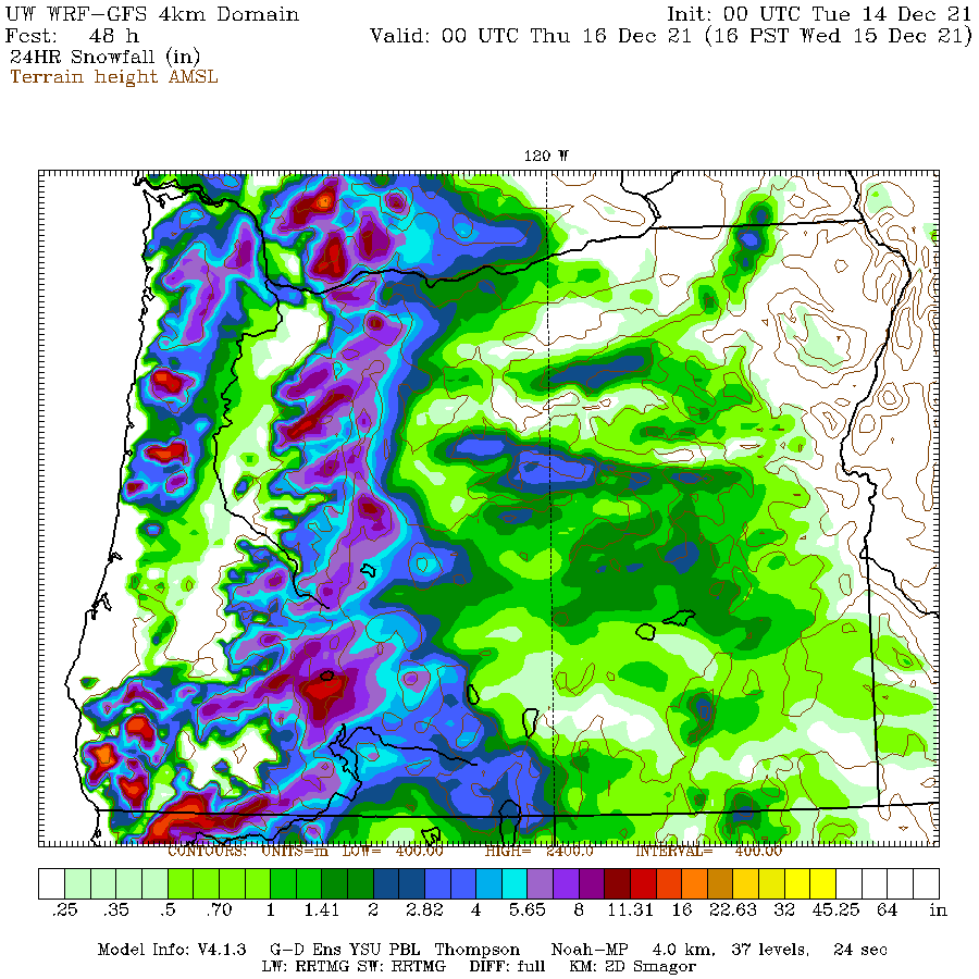 3.) For now plan on snow as being a possibility Wednesday here in the valley – specifically the western valley locations like Corvallis, south and west Salem MAYBE, as well as in Independence, Dallas, Newberg, and McMinnville. This map shows this well with snow coming very close to the valley floor on the western side of the Willamette Valley while locations generally east of l-5 see a mix or just plain ol’ rain.