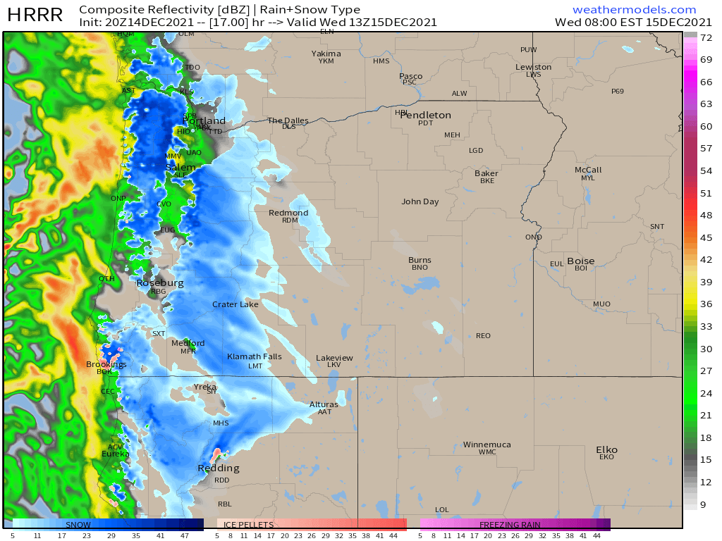 This radar image for 6AM Wednesday morning shows just how close we will be to seeing snow here in Salem. This image shows sticking/accumulating snow is more likely to occur in the western parts of the Willamette Valley and locations higher up in elevation. Remember you can click on the image to get a closer look. 🙂