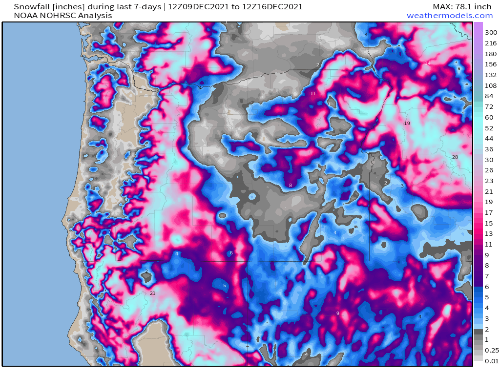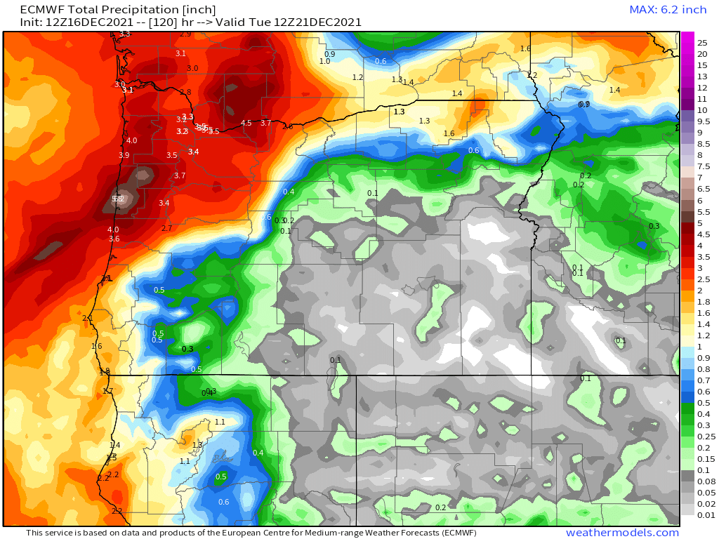 Many of the higher elevations in the Coast Range have over a foot of heavy wet snow on the ground, and there are several feet up in the Cascades. Now look at how much rain is expected between now and Monday night. Keep in mind most of this is forecast to fall in just two days – Sunday and Monday.