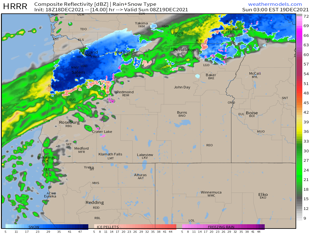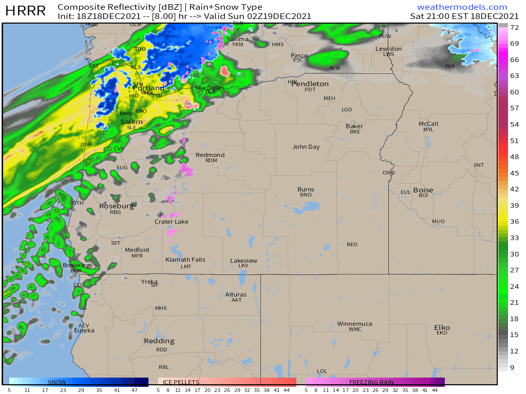 Heavy rain will turn to a heavy wet snow tonight for many locations between Salem and Portland. The snow may not stick all that much, but it will make for extremely hazardous travel conditions. This is a situation where the precip will be falling heavy enough behind the cold front to literary drag the snow level to the valley floor. This radar image shows what conditions should look like around 6pm. Lots of heavy rain with the front moving through…