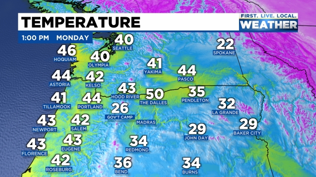 The rest of today will be showery with snow mixing in at times as many of you have already seen. I expect very little (if any) accumulation – maybe a dusting, but not much more than that. What I do expect are roads to possibly be icy tonight and tomorrow morning. With all these showers around it’s easy to imagine roads being slippery overnight. Right now the cold air is still hundreds of miles away, but it’s coming. Check out the temps as of 1PM today across the NW. Spokane really stands out sitting at a chilly 22° while 135 miles to the south in Pasco WA is still in the mid 40s.