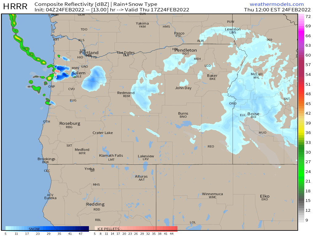 We have a chance of seeing flurries or even some light snow showers early Thursday morning. This is not going to be a big snow storm at all, but with nothing else going on weather wise I figured it would be prudent to mention it. This won’t be even close to the amount of snow we saw after Christmas. Basically you can expect snowflakes in the air with a small chance of a light coating/dusting of snow in some neighborhoods. It’s plenty cold to stick, but there just isn’t much moisture available. Here’s an estimated radar image for tomorrow morning at 9AM showing a few light snow showers around Salem.