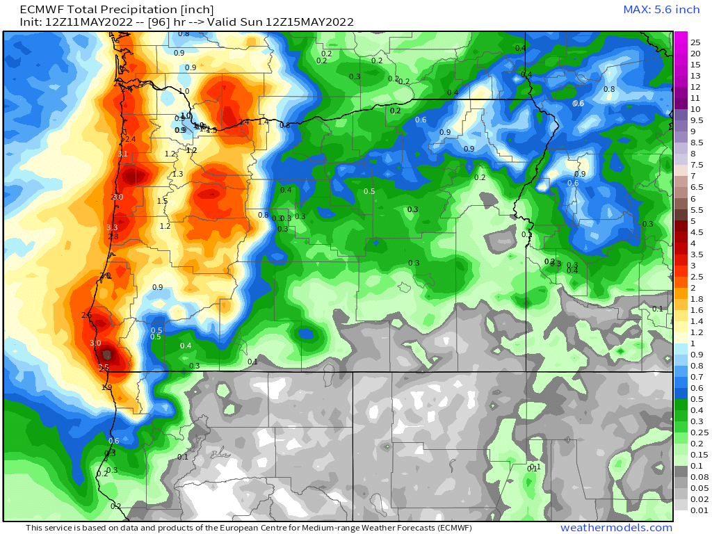 The map below illustrates well how much rain we are expecting through Saturday. Looks as though we are set for a solid 1 to 1.5 inches of rain for the mid Willamette Valley and even a bit of rain east of the Cascades again which is good news for their drought conditions.