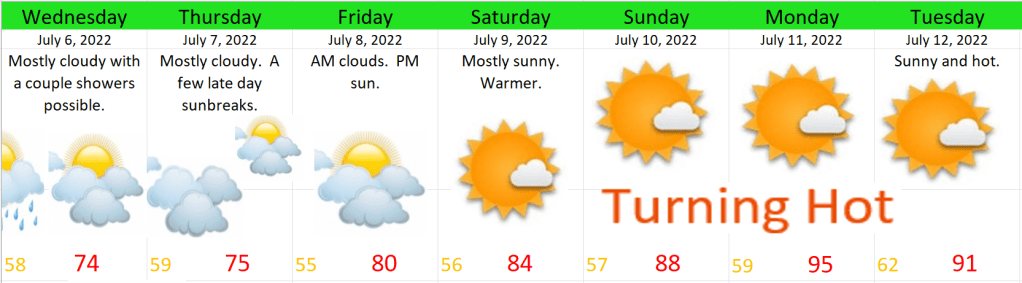 We were fortunate to have a completely dry Independence Day with a high temperature of 80 degrees. Today we have seen a few sprinkles and even a couple of showers. At any point between now and Wednesday night we could see a brief shower and maybe a rumble of thunder as these showers move across the region. The cooler air and showers are quite refreshing, but it is summer, and I know we generally root for sun this time of year, so the good news is we have a beautiful weekend coming up. Here’s our 7 day forecast.