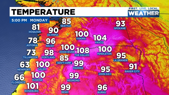We are wrapping up day 2 of what will be one of the longer heatwaves we have seen in a few years. No, not the hottest (that title will likely remain with June 2021 for quite awhile), but it will be a very prolonged heatwave. Yesterday Salem reached a high of 94°, and as of 5PM today, we have reached 100°. Phew! Check out the toasty hot temperatures dominating the Pacific Northwest.