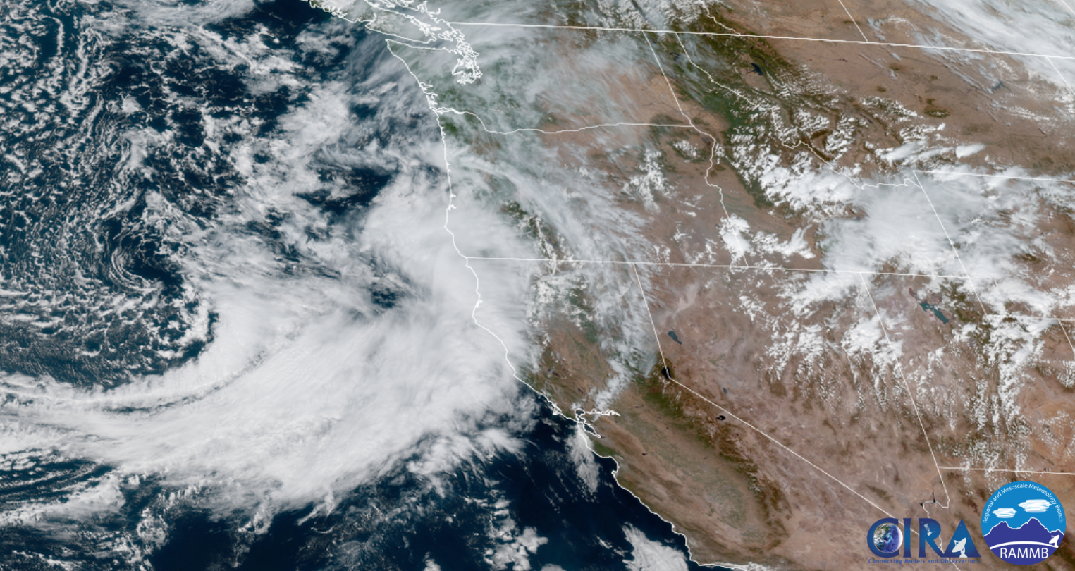 Basically we are on the northern edge of very moist storm which is aimed for California. This is GREAT news for bringing the wildfires under control plus a good soaking rain like this should help prevent any new late season fires from starting. This satellite image from around 1:30PM does a good job of showing the storm’s location as it prepares to hit California.