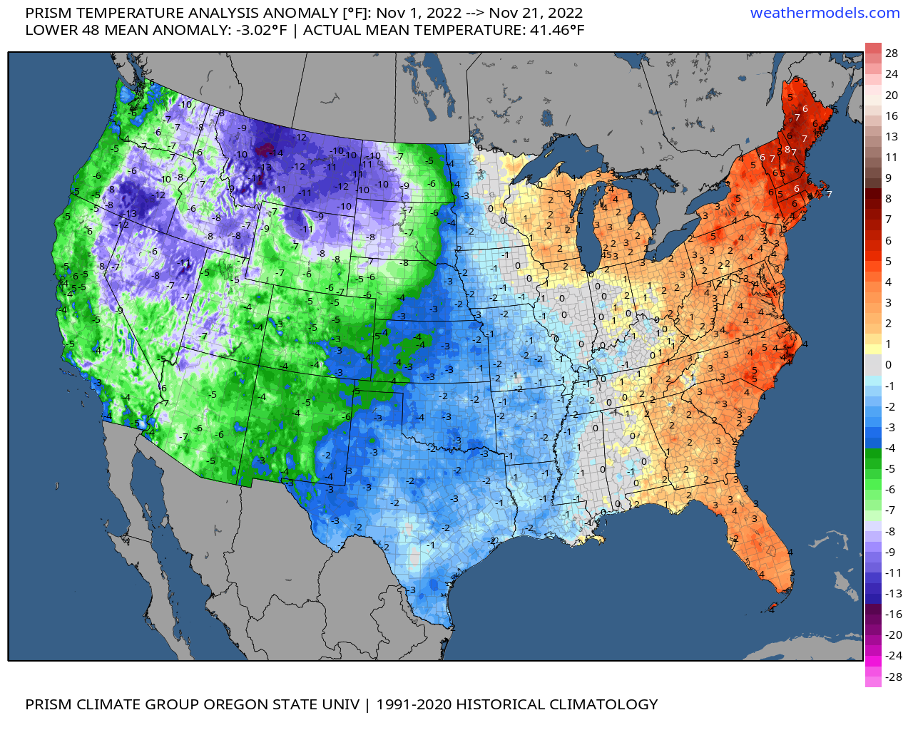 As of the 22nd, Salem has seen 12 days with temperatures at or below freezing. We are quite literally running polar opposite of the sizzling warm temps we experienced back in October. Currently for the month we are sitting 5.5° below normal. Brrrr! Check out how the entire country is looking as of the 21st. Very chilly/cold in the west – a stark contrast to October for sure!
