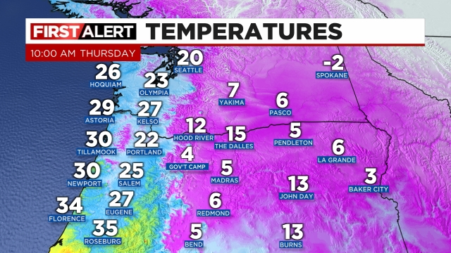 4.) We warm up Saturday; however, Portland and the gorge stay frozen until Saturday evening or even Sunday.