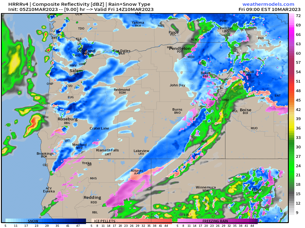 It’s late, but for those who are still up I have a quick update for you all. Just got home from some very enjoyable family time – don’t miss out on the things that matter š and it’s looking like we will have yet another brush with winter Friday morning. Right now as I write this, very cold air up in the atmosphere is approaching the coastline of Oregon and will be over us by 3 or 4AM. Heavy showers will accompany this cold air and the heavy precip will drag that cold air and consequently the snow level down to the valley floor in some locations. We have seen this time and time again over the past 3 or 4 weeks now. Each time someone in the Willamette Valley scores some heavy wet snow while other areas got nothing.