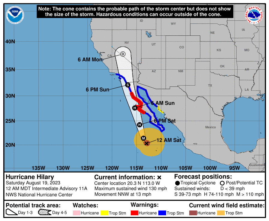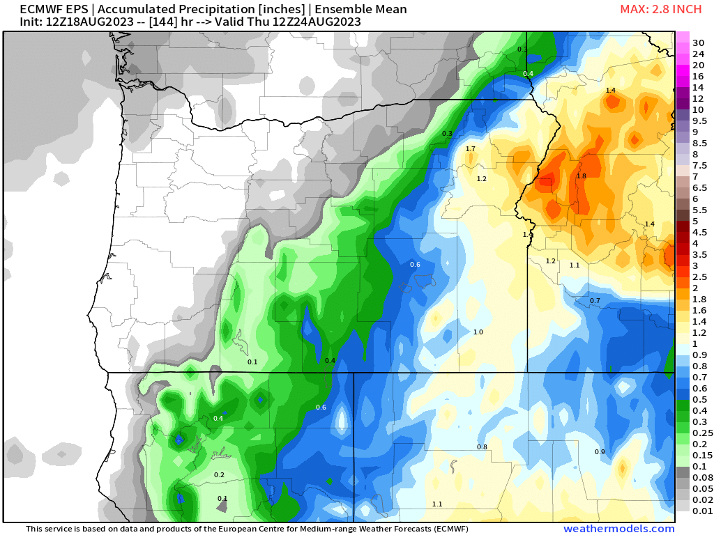Second, it has become clear we will now stay dry through the next several days. In the previous update I mentioned Salem had a chance for a couple showers Sunday and Monday. Well that chance has shifted to our east. In fact, eastern Oregon is expected to get soaked in the coming days as the leftovers of Hurricane Hilary move through that particular region. Here’s the forecasted track of the storm.