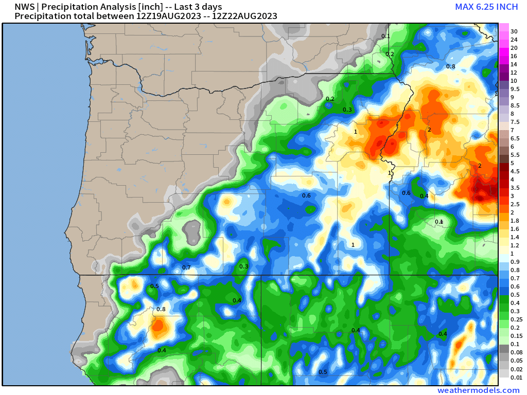 As mentioned in the previous update, the remnants of the hurricane were forecasted to move through eastern Oregon, and sure enough they did. Check out the 3 day rainfall totals.