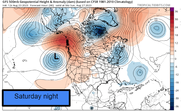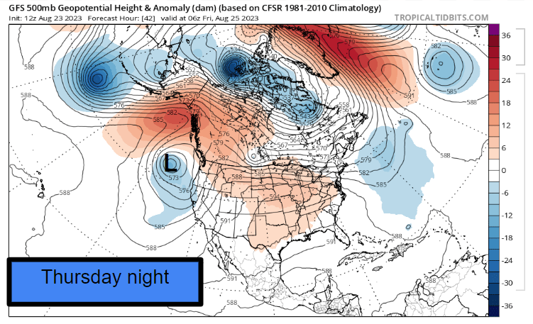 Moving onto the forecast, it’s looking more interesting as we could have our best chance for thunderstorms of the entire summer this Thursday night and Friday. We could see a rare nocturnal thunderstorm event thanks to an upper level low pulling monsoonal moisture from the south. Below are three images showing the position of this upper level low. These charts are showing wind direction and temperature anomalies for this time of year for about 13,000 feet up in the atmosphere.