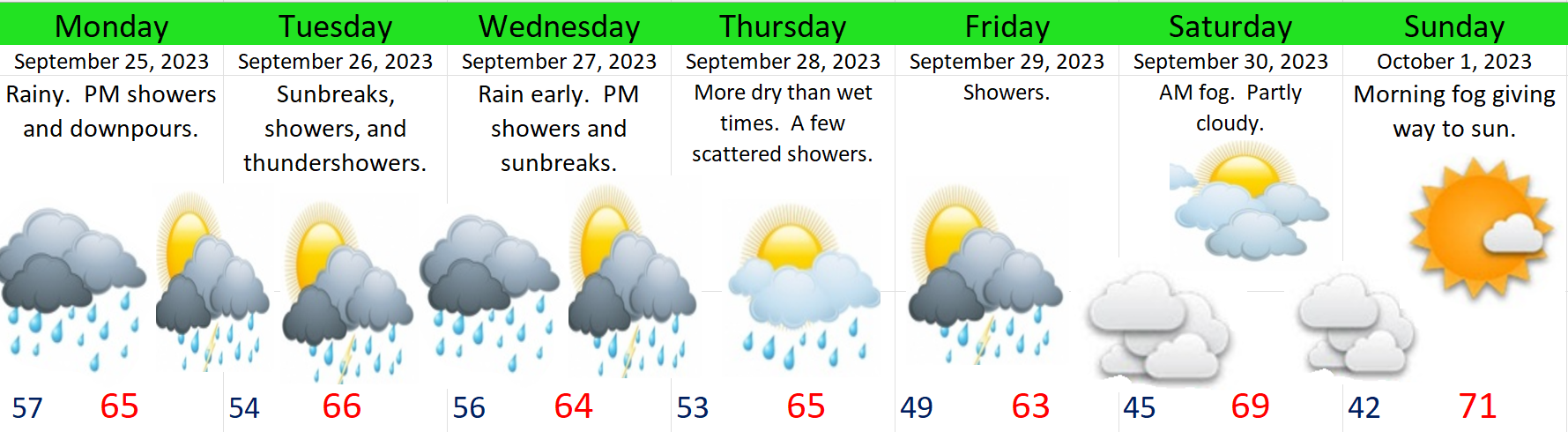 Saturday and Sunday: We will end September and kick off October with a beautiful fall weekend. Both next Saturday and Sunday should be excellent days for outdoor events. Morning fog is likely, but with plenty of afternoon sun. Slight chance for showers Saturday, but the vast majority of the day will be dry. Sunday should stay 100% dry, and actually, next Monday will probably stay dry too. Chilly overnight lows though. Lows 42 to 46°.
