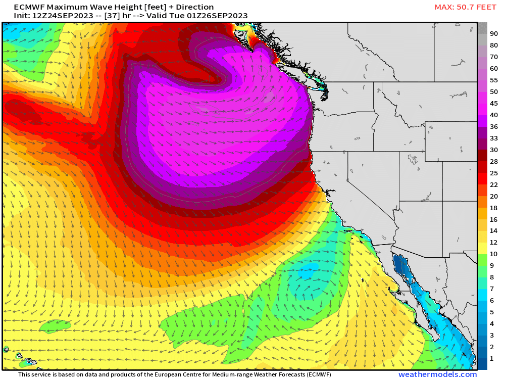 Waves will dramatically increase in strength and size tonight through Wednesday. No tiptoeing into the storm season this year out along our beaches and headlands. Wonderful wave watching weather, but dangerous if you find yourself too close to the surf. This map shows the maximum wave heights (in feet) expected Monday evening. Looks like 30 plus foot waves out there near the coastline with higher waves out at sea.