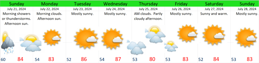 We have another opportunity for showers and maybe some thunderstorms tonight and Sunday morning. Other than that, the rest of the coming week looks good with cooler nighttime lows, more morning clouds than what we’ve seen lately with warm and sunny afternoons. Highs in the 80s. No 90s whatsoever after today through at least next Sunday.